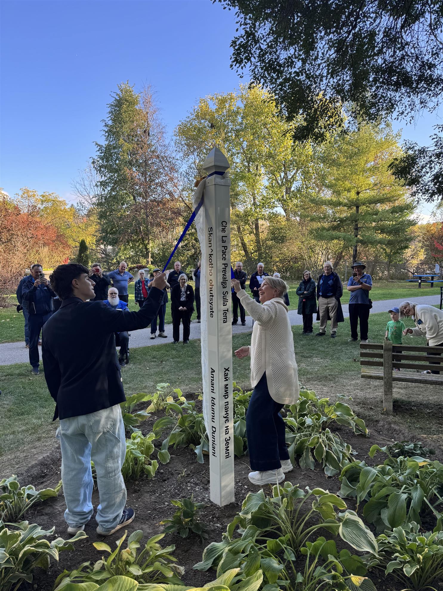 Past Rotary International President Jennifer Jones, with the assistance of Samir Zogbi, inbound exchange student from Argentina, unveiled the new Rotary Peace Pole on October 14, 2025. The peace pole is located in the Horticultural Society's Peace Garden.